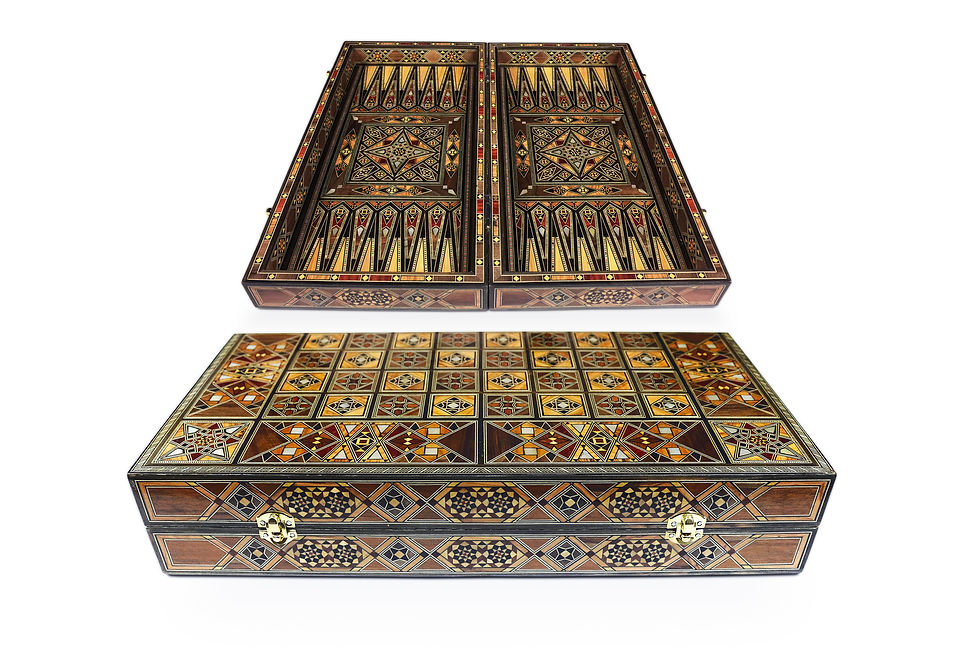Aufklappbares Spielbrett aus Holz für Schach und Backgammon, handgearbeitet und mit Mosaik verziert aus dem Holz verschiedener einheimischer Bäume (Rosenholz, Zitrone, Walnuss), ergänzt durch wertvolle Intarsien aus Perlmutt.